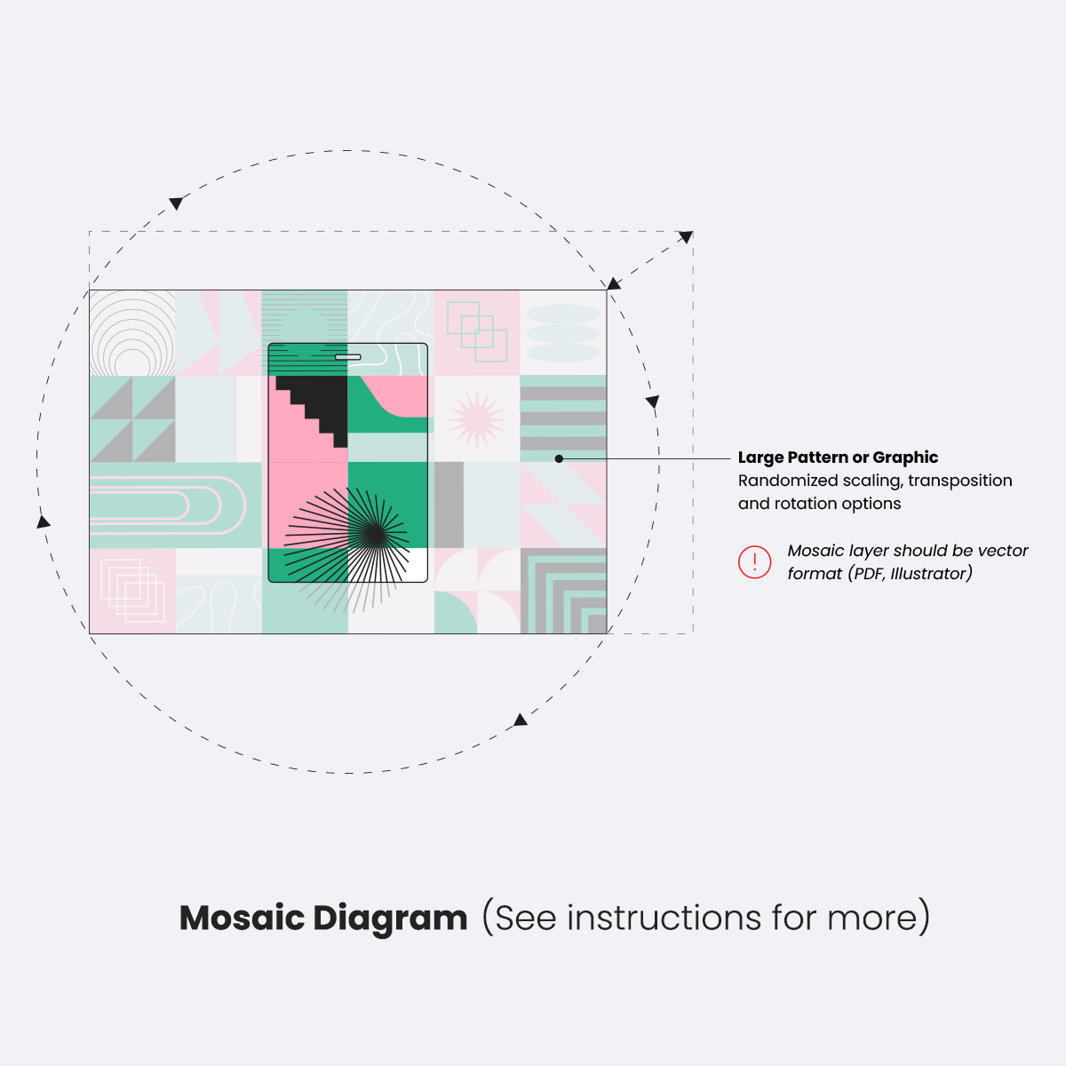 Mosaic artwork should be in vector format (PDF, Illustrator). Larger images and patterns work best for variation. We recommend artwork dimensions are a minimum 200% of the final print area. Scaling, positioning, and rotation are each optional and can be combined depending on desired output.